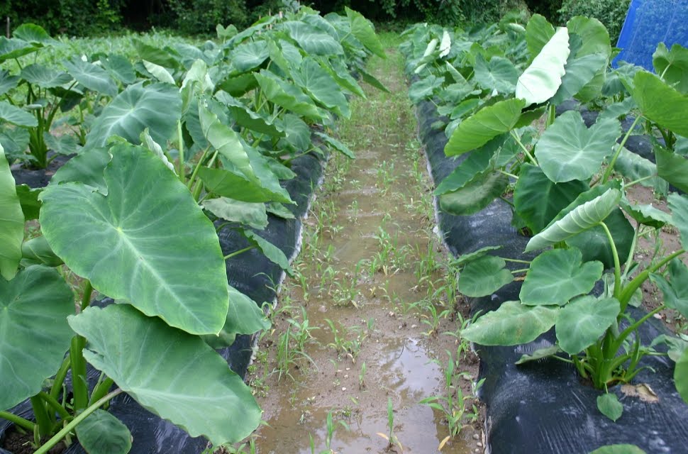 七夕が近くなると、「里芋の葉の上にある水滴を集めて、それで墨をすって願い事を書くと願いがかなう」というようなことをいわれた記憶が蘇ってきます。朝早く畑に行くと、里芋の葉の上にはたくさんの水滴がのっています。私は、いままでこの水滴は結露かなにかでできたものだと思っていました。しかし、実際はこれは里芋が葉から放出している水なのだそうです。たしかに、よく観察すれば、細かい水滴がびっしりと葉の表面についていますし、だんだん盛りあがってきて、細かな水滴が集まってしだいに大きな水滴へと成長していきます。
